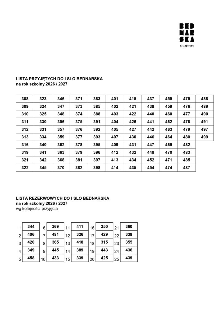 Adres kontaktowy ze szkołą dla osób z Listy przyjętych do I SLO to liceum@bednarska.edu.pl